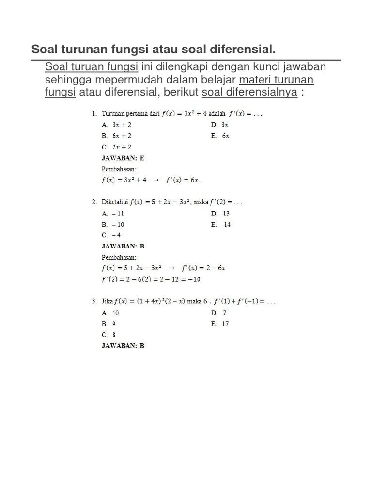 Contoh Soal Turunan Fungsi Aljabar Halaman All Kompas